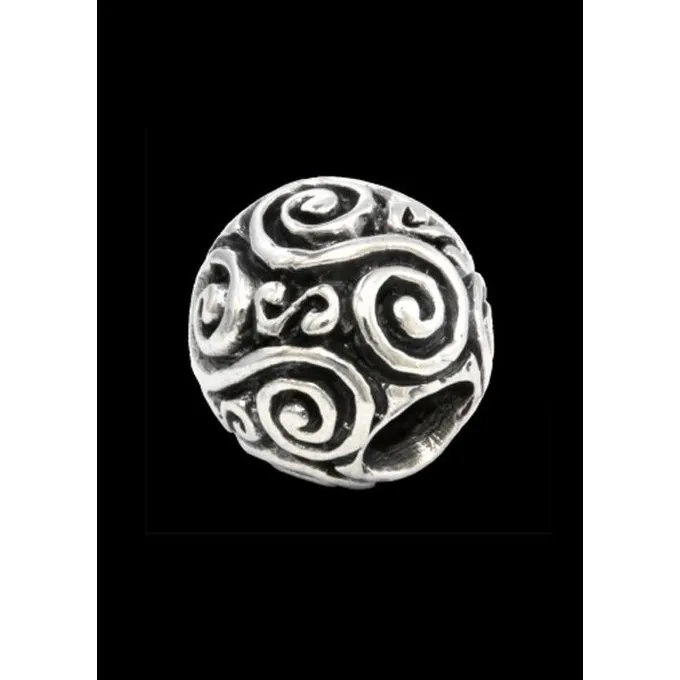 A round beard bead with Viking knot motive. It can also be hung to a necklace of bracelet. It is made of Sterling silver and has a diameter of approx. 1,1 cm. It weighs approx. 3,6 grams.