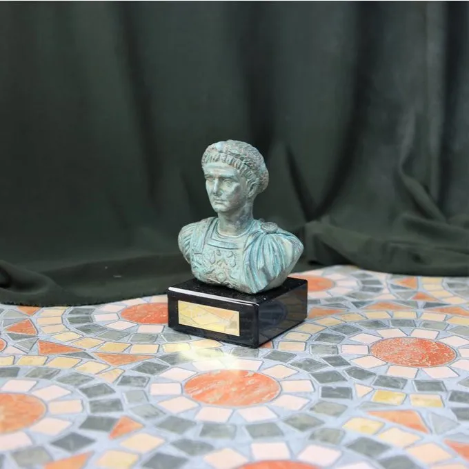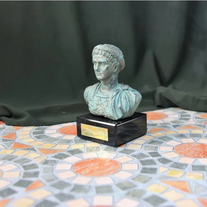 This bust is a replica of a bust of emperor Tiberius. The original is part of the collection of the Archaeological Museum of Napoli. These statues were often painted to make them appear life-like.