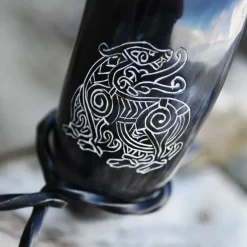 Over the centuries, the drinking horn has been used by different peoples as a cup during ceremonies and celebrations. The use of the drinking horn is even mentioned in the Edda. This horn is perfect for Viking reenactment, home decor, LARP and makes a wonderful gift. It is also ideal for festivals. This drinking horn is hand made from buffalo horn and is polished. There is a layer of varnish on the inside so that you can drink from the horn. It comes with a metal stand with which you can place it on the table. The horn is engraved with a dragon. This is a popular motif in Viking art and is found on jewelry, stones, and woodwork.
