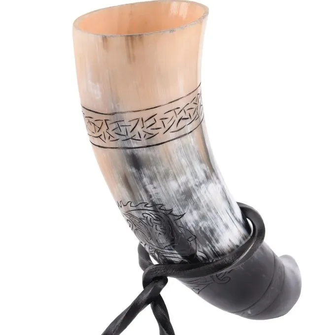 Over the centuries, the drinking horn has been used by different peoples as a cup during ceremonies and celebrations. The use of the drinking horn is even mentioned in the Edda. This horn is perfect for Viking reenactment, home decor, LARP and makes a wonderful gift. It is also ideal for festivals. This drinking horn is hand made from buffalo horn and is polished. The interior is varnished do you can drink from it. It comes with a metal stand with which you can place it on the table. The horn is engraved with the wolf Fenrir. In Norse mythology, this is the son of Loki and the giantess Angrboda. He fights against the world order and eventually brings about the end of the world, Ragnarok. He is chained to the bottom of the sea until he will eventually devour Odin and destroy the world.
