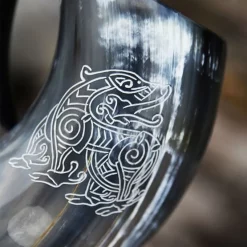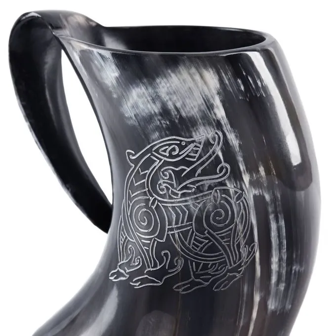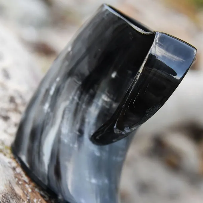 This beautiful horn cup is handmade from buffalo horn, polished and engraved. The inside is provided with a varnish so you can drink cold drinks from it. Use this cup for LARP, festivals or to enjoy your favorite drink at home. It is also a beautiful decoration piece and very nice to give as a gift. The cup is decorated with a dragon motif. This is a popular motif in Viking art and is found on jewelry, stones, and woodwork.