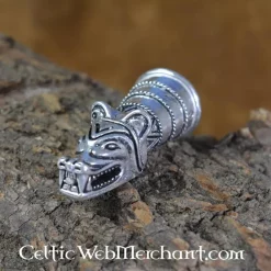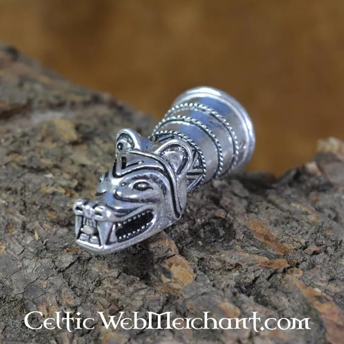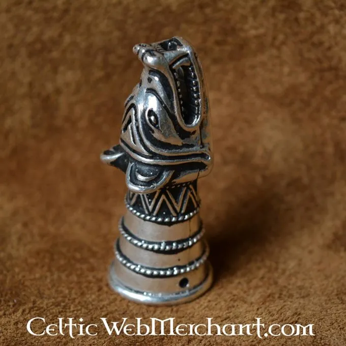 This drinking horn decoration is a replica of a 14th century original excavated at Castle Douglas in Scotland (Dumfries, Galloway). This 13th century drinking horn decoration refers back to the Viking period and was possibly based on an even older original. This drinking horn decoration is made of bronze and it is 5,7 cm long, 2,2 cm wide and has a shaft of 4 cm. It is suitable for drinking horns with a diameter of 1,9 cm at the tip.