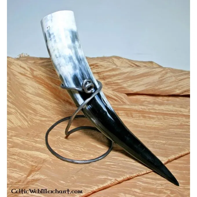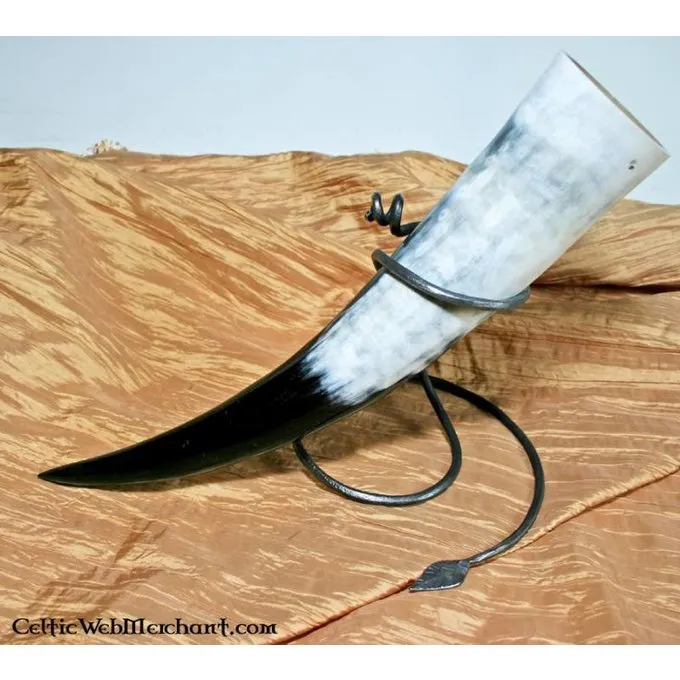 This drinking horn holder is completely hand-forged. It provides space for one drinking horn and is decorated with snake heads. The holder is suitable for drinking horns of a max. volume of 0,3 l. It is delivered excluding the drinking horn.