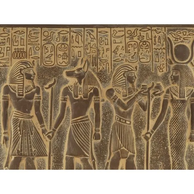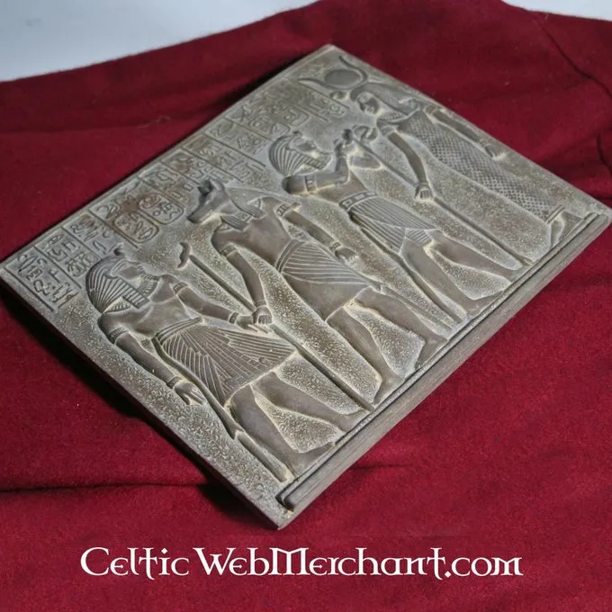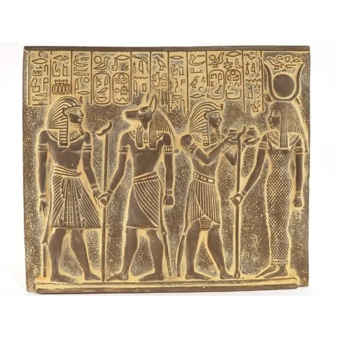 On this relief are depicted from left to right: Tut ankh Amun, Anubis, Ramses II and the goddess Isis. The relief measures 26 x 22 cm and is made of plaster alabaster. The back is provided with a hole to hang it to a wall.
