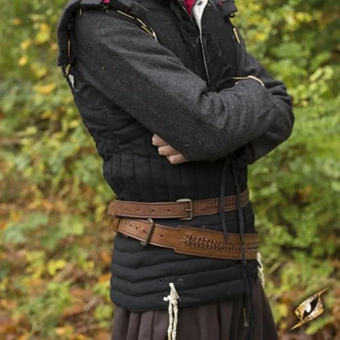 Sword belts like this were worn during the Middle Ages and the Renaissance. This belt is decorated in an authentic historic style with a beautiful hand-woven leather motif across the width. The belt consists of two parts: the upper part is narrower and worn around the waist, the lower part is wider and falls around the hips. The belt has a ring to attach a scabbard. WIth this belt your sword can hang comfortably around your waist for a longer period of time.