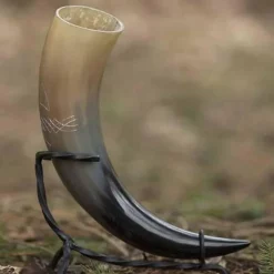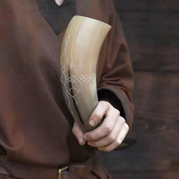 Drinking horns were already used by the Greeks and Romans in antiquity and during the Middle Ages drinking horns had a ritual and ceremonial function. This beautiful drinking horn is made from natural horn that has been selected for its lighter color. You can fill this horn with no less than 0.5 liters of your favorite beverage! The exterior is polished so that it has a smooth, luxurious surface and it is engraved with an organic pattern. The inside of the horn has been treated to make it suitable for drinking, and a wax layer has been applied for extra durability. This drinking horn is perfect for festivals, re-enactment, LARP or just for a lazy evening on the couch.