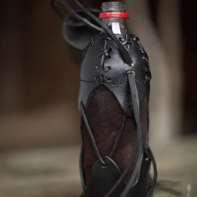 This is the perfect attribute for the seasoned festival goer. Almost all plastic water bottles from the supermarket fit in this holder. Are you wandering around thirsty during a summer event grabbing your plastic water bottle? Now you can do that completely in style! This holder is also perfect for LARP battles, matching your costume style.