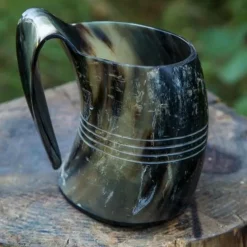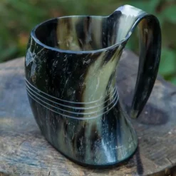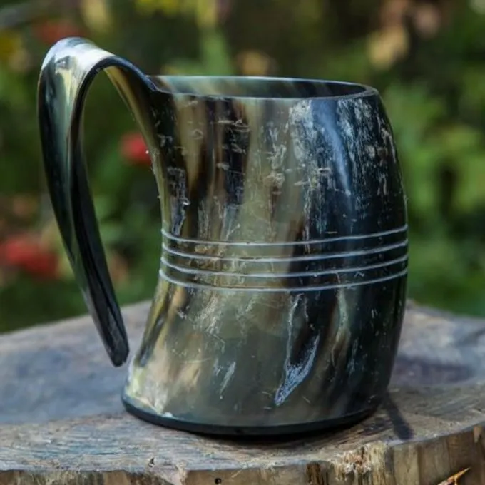 Handmade horn drinking cup as used in various series, like Vikings, Game of Thrones and The Last Kingdom. This mug can contain up to 0,5L of your favorite beverage. The cup has a handle for holding it. The outside is smoothly polished for a luxurious look and is beautifully decorated with four engraved rings around the cup. The inside is also polished and provided with a protective layer so that it is suitable for consumption of liquids. Please note: his mug is not suitable for warm liquids. Perfect for festivals, re-enactment, LARP or just relaxing at home on the couch.