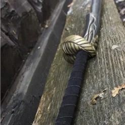 This LARP hand-and-a-half sword is based on originals that were used around the 15th century. Hand-and-a-half swords like this are depicted in combat books by Hans Talhoffer. This hand-and-a-half swords is made of foam and has a fiber glass core. The core is covered with a layer of Kevlar.