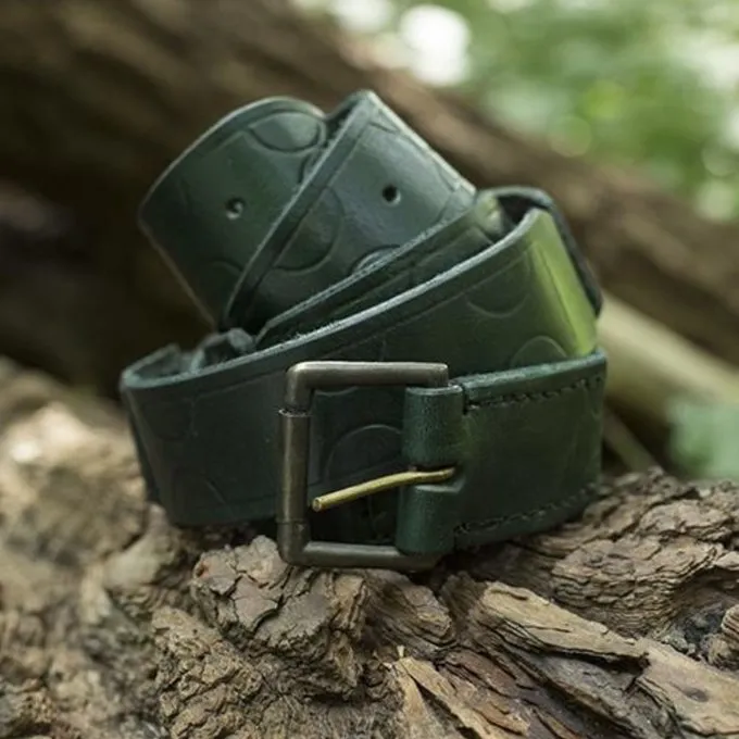 The belt is beautifully decorated with a motif that is imprinted deep into the leather. The belt has an exciting appearance, it consists of different leather pieces that are connected to each other with small square pieces.