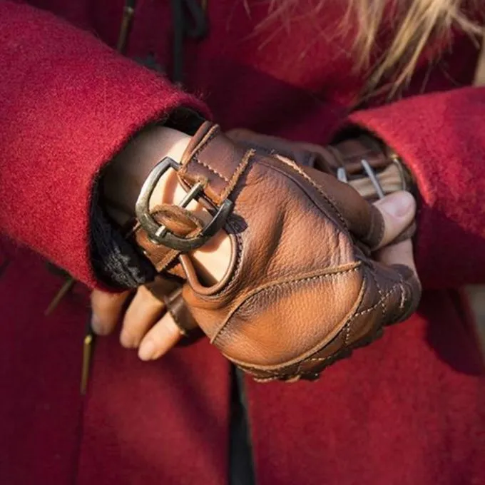 These practical fingerless gloves are made of high quality vegetable tanned leather. Do you need protection or heating of the hands, but simultaneously a maximum flexibility of the hands and fingers? Then these gloves are a perfect match. The gloves have hand-stitched seams, which makes the material more durable and less likely to tear or damage. Around the wrist is a buckle to fasten the glove. These gloves are a great accessory for any costume.