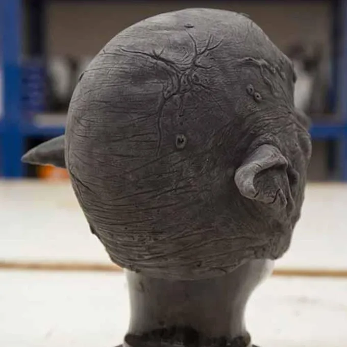 This mask shows the typical facial features of a goblin: a long pointed and slightly curved nose with large nostrils, pointed ears, a chin with horns, and a skin with different textures. The mask is open at the mouth so you can just keep talking and breathing. This goblin is not painted yet, so you can adjust it completely to your own wishes! Use latex paint in thin layers (finish with a layer of baby powder) and / or water-based makeup.