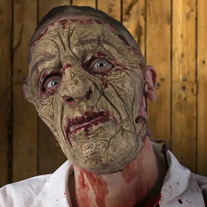 This high quality 100% latex mask is made in the shape of a cut-off human face. After defeating your human enemy, you have stolen his face and you wear it as a trophy to show off your victory and your combat skills. This mask covers the entire face and has holes for the nose, eyes and mouth so that you can just keep looking, smelling, eating, drinking and talking. The mask is hand-painted in a morbid skin color and has traces of blood so that it really looks like a cut-off face. You can fasten the mask behind your head with the leather cords. A perfect accessory for LARP, Cosplay, theater, Halloween etc.