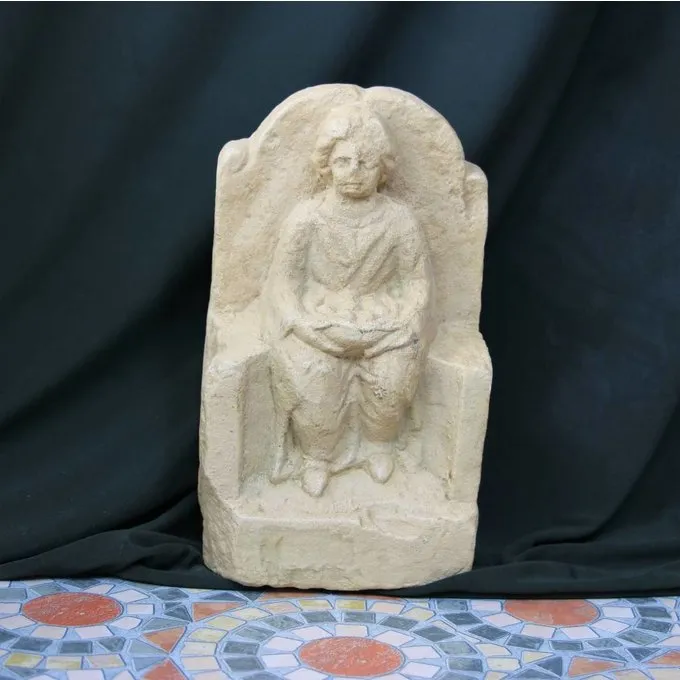 The relief is a depiction of the sitting Celtic horse goddess Epona. A fruit basket is placed on her lap. The Celtic goddess Epona was taken over by the Romans after the Gaulish wars and was worshipped in i.a. Roman Gaul.