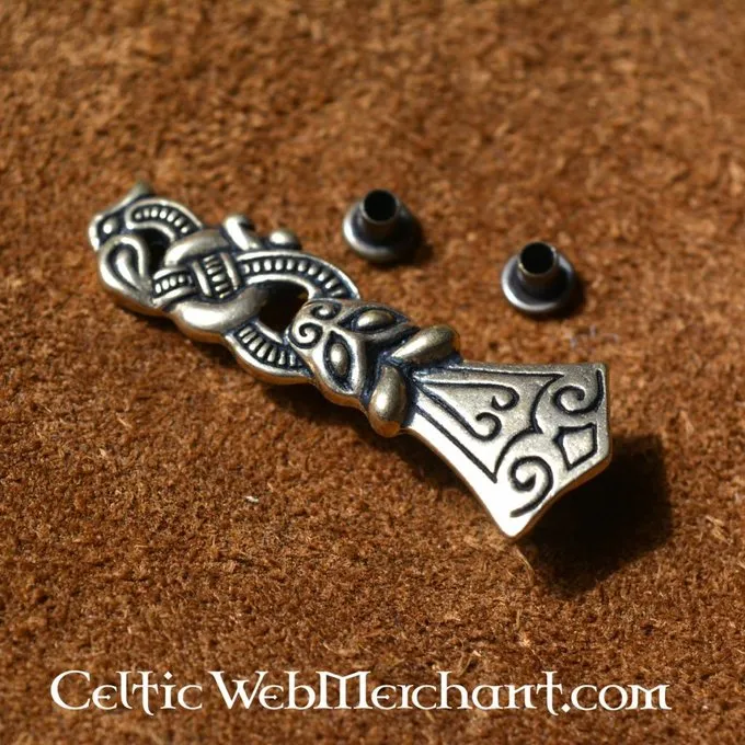 This belt end is based on an original from the 11th century found in Gotland (Sweden). Similar ends were also found on the East Sea coast in Russia. They were used by i.a. the Vikings from the Baltic sea area, the Rusvikings. This belt end is decorated in the Borre art style.