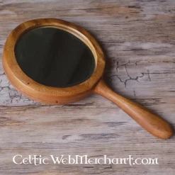 This Celtic hand mirror is made of soar wood. It contains a depiction of Yggdrasil, the Viking Tree of Life. The mirror has a diameter of 15 cm, its total length is 29,5 cm.