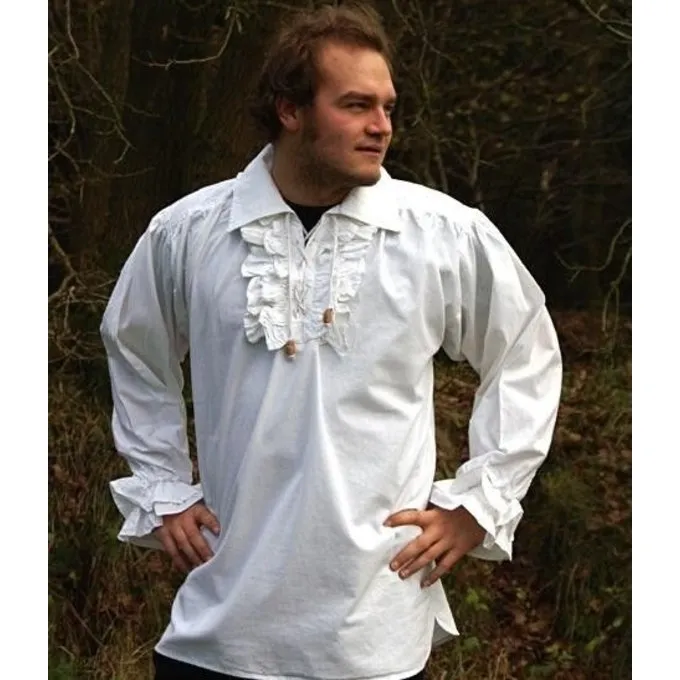 This shirt is made of cotton. The neckline is ruffed and it has a cord for fastening. It is available in the colours black and white in size S up to XXL.