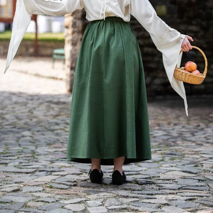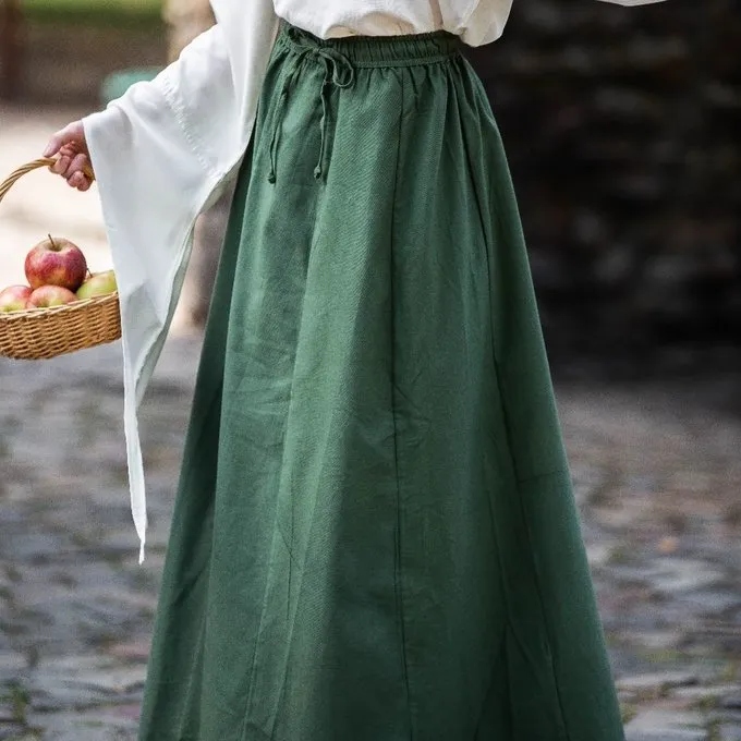 This skirt is made of a heavy cotton-linen mix and the waist has an elastic band for a good fitting size. It is available in the colours black, cream, green, brown and red in the sizes S-M, L-XL and XXL.