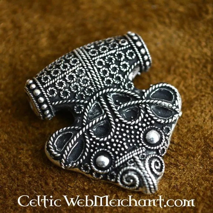 This beautiful Viking jewel is a replica of a 9th century original excavated in Sigtuna, Sweden. This Tho’s hammer ends in a raven motif and is semi-granulated. Sigtuna was founded around 980 by the Viking king Erik Segersäll. This town replaced Birka as most significant trading post.