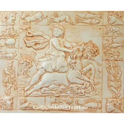 This relief is made after a depiction from the Mithras cult. It is made after a Mithras altar piece from Aalen. Nowadays the original is part of the collection of the slate museum in Aalen.