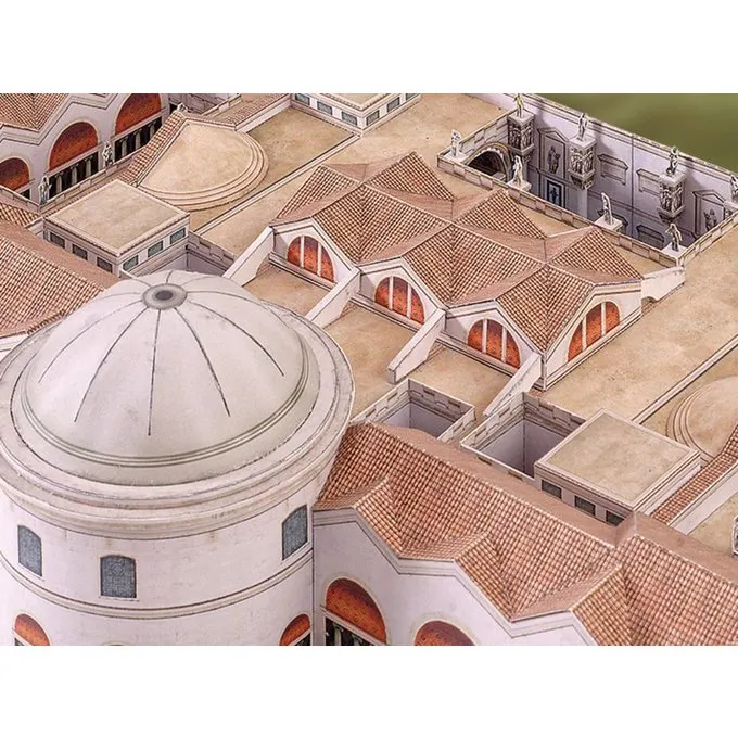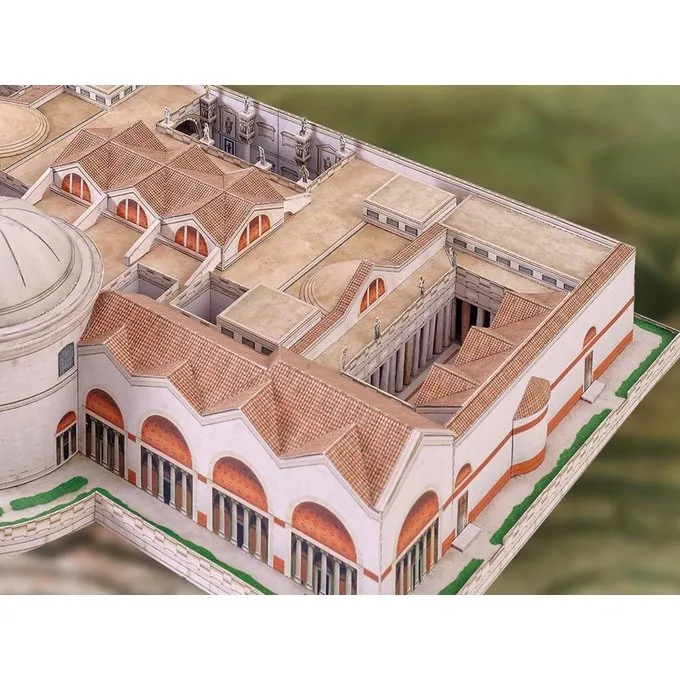 This model building kit has an average to hard level of difficulty. It is made of A3 carton and printed in 8 colors. This thermal bath model measures 40 x 28 x 10 cm and is made on the scale of 1:600.