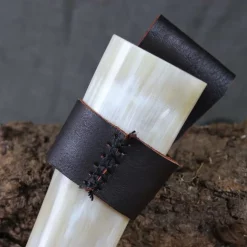 A Mytholon leather holder for drinking horns and signal horns. With this holder you can hang your horn to your belt, so that you always have it at hand. A perfect accessory for LARP, festivals, medieval fairs and reenactment. If you are not at a festival, you can hang the holder at home and display your beautiful horn. The holder is made of authentic leather and fits great with a medieval, Viking or fantasy outfit. It has a leather lace to adjust it to size and making it bigger. If you want to make the holder smaller, you can make holes in the leather. You can therefore use it for several horns. This holder is available in two sizes.