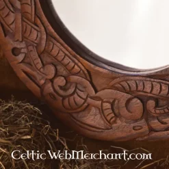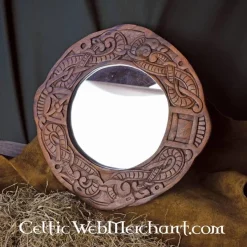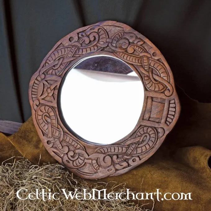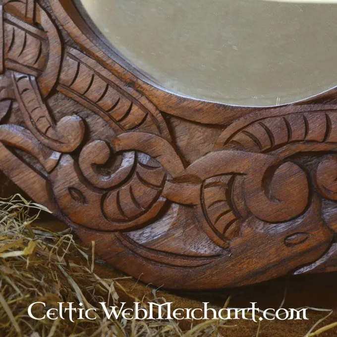 This beautiful mirror is made in the Urnes style. Hand-carved Viking dragons encircle this mirror. The dragons are intertwined in a knot motive. The mirror is completely functional and measures approx. 40 x 40 cm. It weighs 1,2 kg.