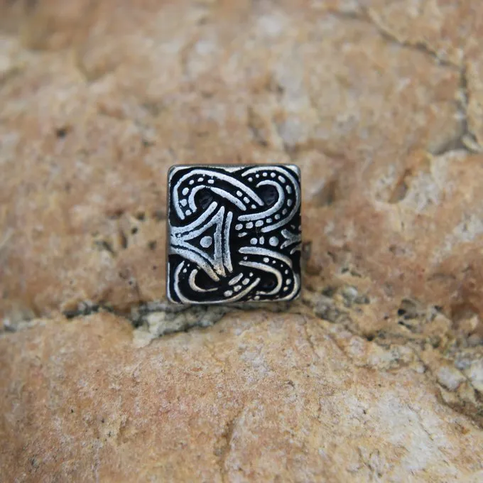 This Viking belt fitting is made in the Borre art style (825-970) and is based on an original fitting excavated in the Viking trading town Birka. The fitting shows a mirrored knot and a triangular shape. It can also be used for decorating leather bags or even shoes. It measures 1,7 x 1,6 cm and is silver coloured or brass coloured.