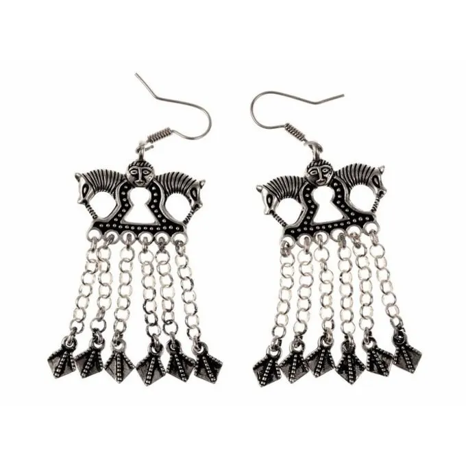 These unique earrings are replicas of a Viking Age pendant from Staraya Ladoga in Russia. The pendant had an image of two horses. The motif of the two horses is common on Viking jewelry and has its roots in Finnish mythology, the Kalevala. It is about the battle between the characters Väinämöinen and Joukahainen. The ringing of the pendant should keep evil spirits and evil away from the wearer.
