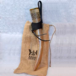 A beautiful drinking horn with brass rim, engraved floral pattern and including a leather holder for the belt. Freya was a beloved goddess for the Vikings. On the one hand, she symbolized strength as chief of the Valkyries. On the other hand, she had a softer side as the goddess of fertility and love. So Freya also symbolizes the versatility of women. This drinking horn is decorated with a luxurious brass rim and engraved floral motifs, in reference to Freya’s role as goddess of fertility. A suede leather holder tailored to the horn is included, so you can hang it on your belt. Perfect for festivals, reenactment and LARP.