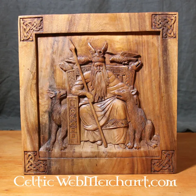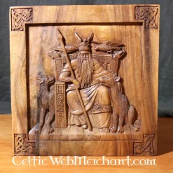 This Viking woodcarving depicts the Viking god Odin. He sits on his trone; on his sides are the wolves who always aided him: Geri and Freki. The ravens who always informed Loki what happened in the world, are also depicted on this detailed woodcarving. The corners of the carving are finished with Urnes style elements.